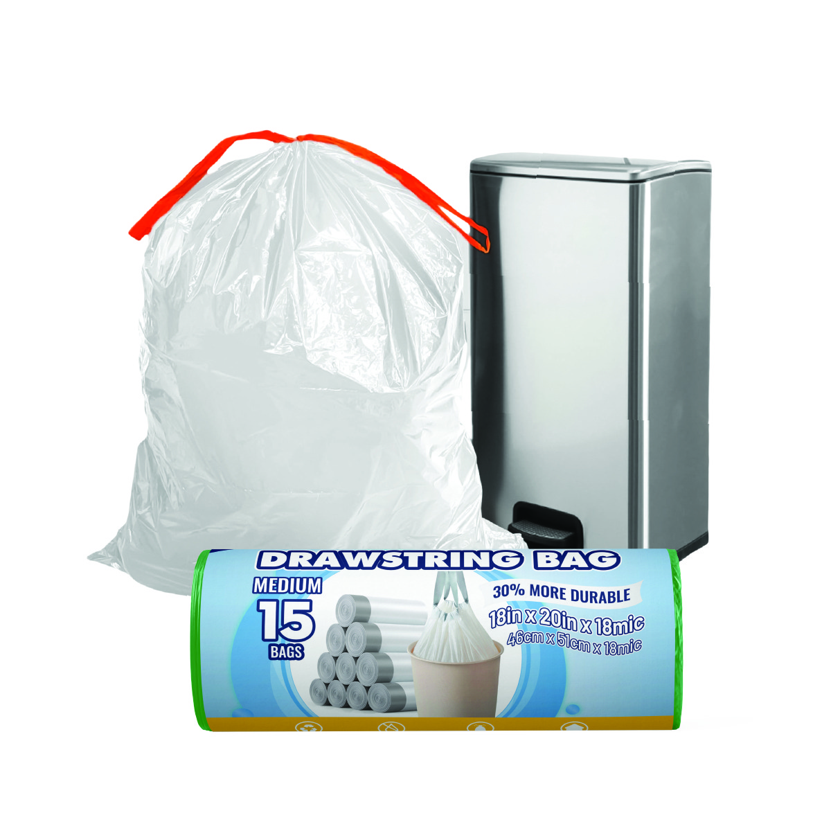 Drawstring Trash Bag, HDPE plastic, Size M, 45.7cm x 50.8cm x 18mic, 15 pcs/roll